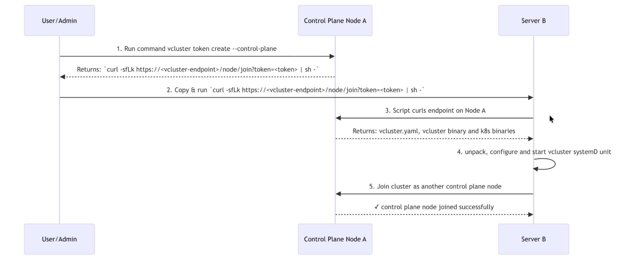 The first node creates a "control plane bundle" containing the vCluster binary, Kubernetes components, and configuration, which new nodes download, extract, and use to join the cluster seamlessly.