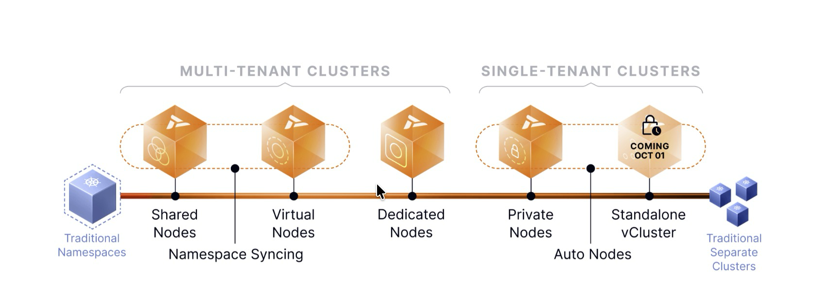 With Standalone as the host, you can create virtual clusters using any tenancy model — Shared Nodes, Private Nodes, or (soon) Auto Nodes. This means teams can tailor isolation to their needs: use Shared Nodes for lightweight dev, Private Nodes for regulated or GPU workloads, and Auto Nodes for elastic scaling. All tenancy models run consistently on top of a single Standalone control plane, simplifying management while optimizing cost, compliance, and performance.