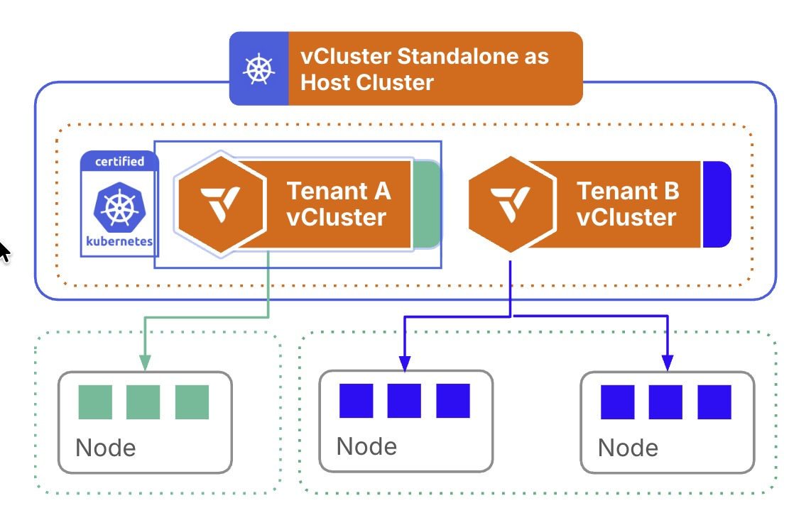 vCluster Standalone is free to use and runs with Private Nodes built-in, delivering strict isolation out of the box. On top of Standalone, you can create virtual clusters just as you would on any other host cluster, whether they are using the Shared Nodes tenancy model or Private Nodes.