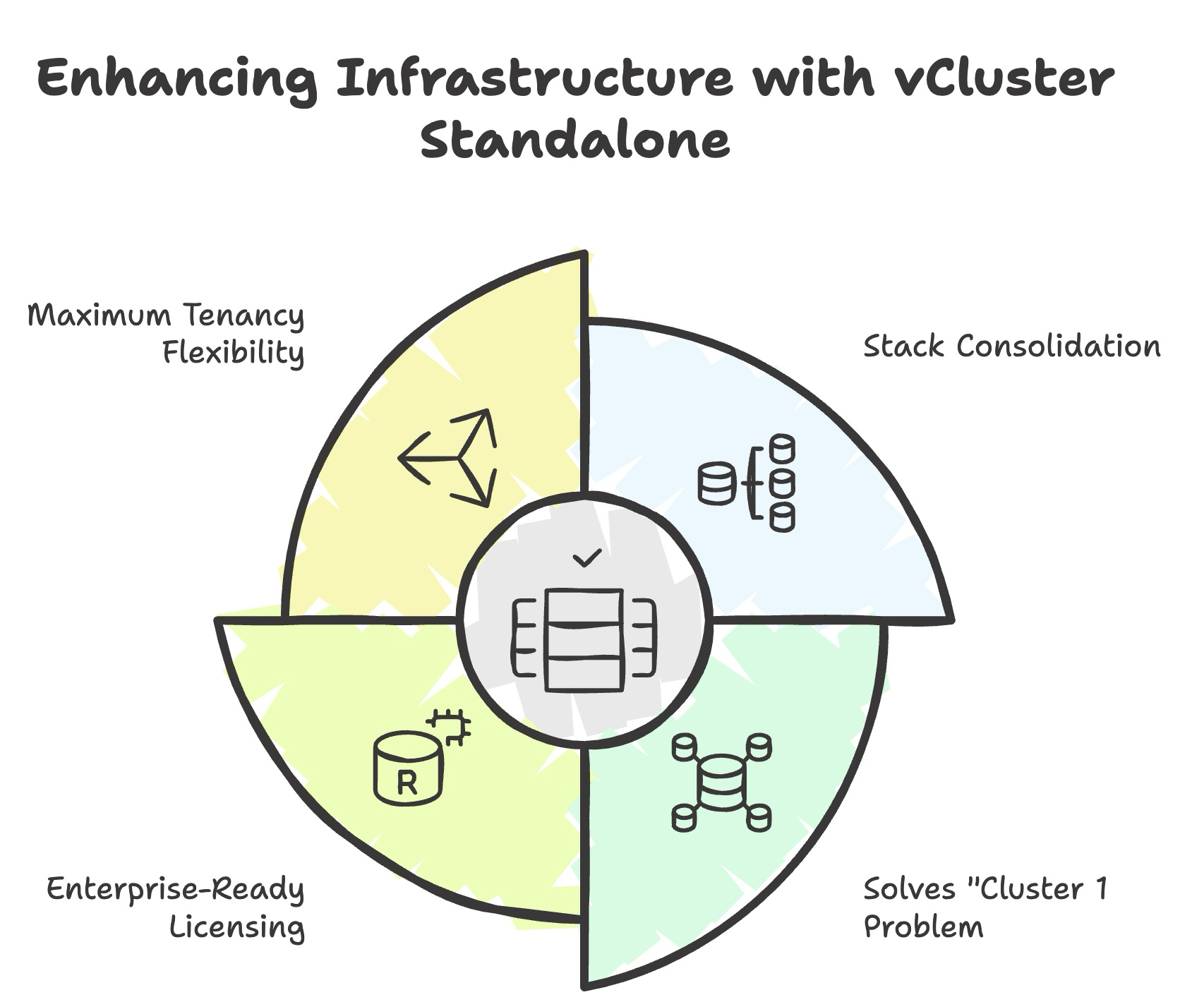 As organizations explore adopting vCluster Standalone, the question naturally arises: how does this benefit your infrastructure strategy? There are many advantages, but five critical areas where implementing Standalone delivers the most impact are as follows: