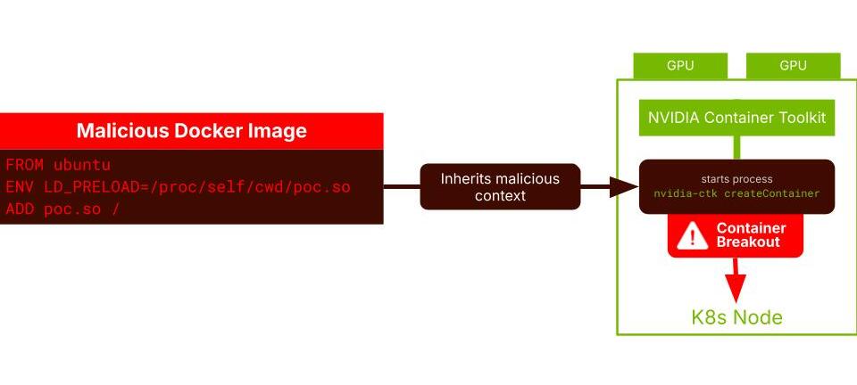 A malicious Docker image sets an environment variable (LD_PRELOAD) that loads a compromised library during container initialization. The NVIDIA Container Toolkit—which needs privileged access to expose GPUs to containers—inherits this malicious context before the container even starts.