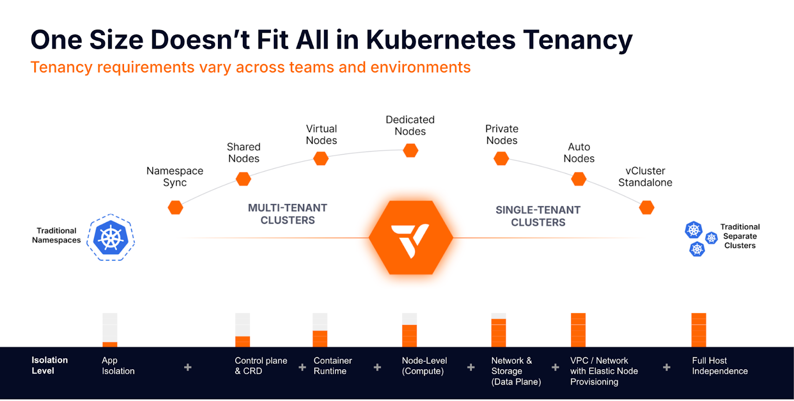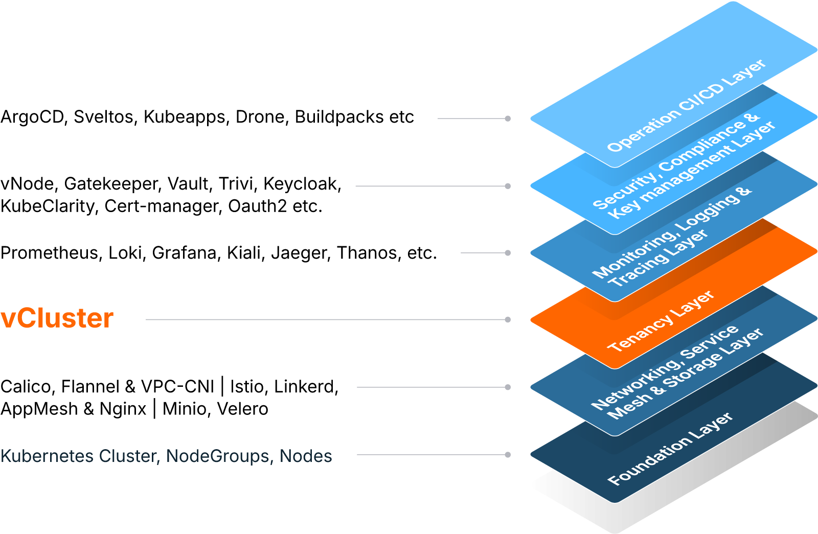 vCluster provides multiple tenancy models from lightweight shared tenancy to hardened cluster-like isolation. This makes it uniquely suited to act as a first-class layer in your stack.